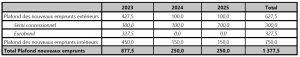 Sur la période 2023-2025, le plafond des nouveaux emprunts s’établira en moyenne à 459,2 milliards FCFA, dont 209,2 milliards FCFA d’engagements extérieurs et 250,0 milliards FCFA d’engagements intérieurs.