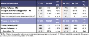 Quant au chiffre d’affaires des activités manganèse, il affiche un recul de 421 millions d’euros au troisième trimestre 2025 (- 26 %). Tandis que celui de l’activité minerai est en baisse de 35 %, pénalisé par le repli des prix de vente réalisés (- 40 %) et par un effet change défavorable, compensés en partie par la hausse des volumes vendus à l’externe (par rapport à une base de comparaison favorable).