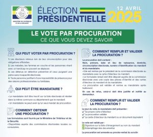 Pour rappel, contrairement à une idée reçue, les demandes de procuration ne se font pas auprès du ministère de l’Intérieur et de la Sécurité, mais exclusivement auprès des commissions électorales locales et consulaires. Raison pour laquelle, il s’avère crucial pour tout électeur anticipant une absence ou une incapacité le 12 avril 2025 de se renseigner et d’entamer les démarches de procuration dès à présent auprès de sa commission électorale locale ou consulaire. « Ne laissez pas une contrainte vous priver de votre droit civique fondamental. Votre vote compte, et la procuration est là pour vous assurer que votre voix soit entendue lors de cette élection présidentielle déterminante », alerte le ministère de l’Intérieur et de la Sécurité.