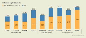 Selon la Banque mondiale, le Gabon, tout en enregistrant un Indice de capital humain (ICH) supérieur à celui de la Communauté économique et monétaire de l’Afrique centrale (CEMAC) et des pays d’Afrique subsaharienne, est à la traîne par rapport aux Pays à revenu intermédiaire de la tranche supérieure (PRITS) https://documents1.worldbank.org/curated/en/099062124141530906/pdf/P1775461acb1f502019bac1bdddd206f86d.pdf